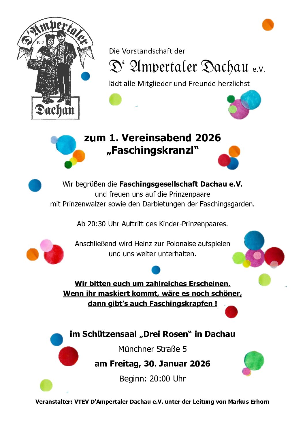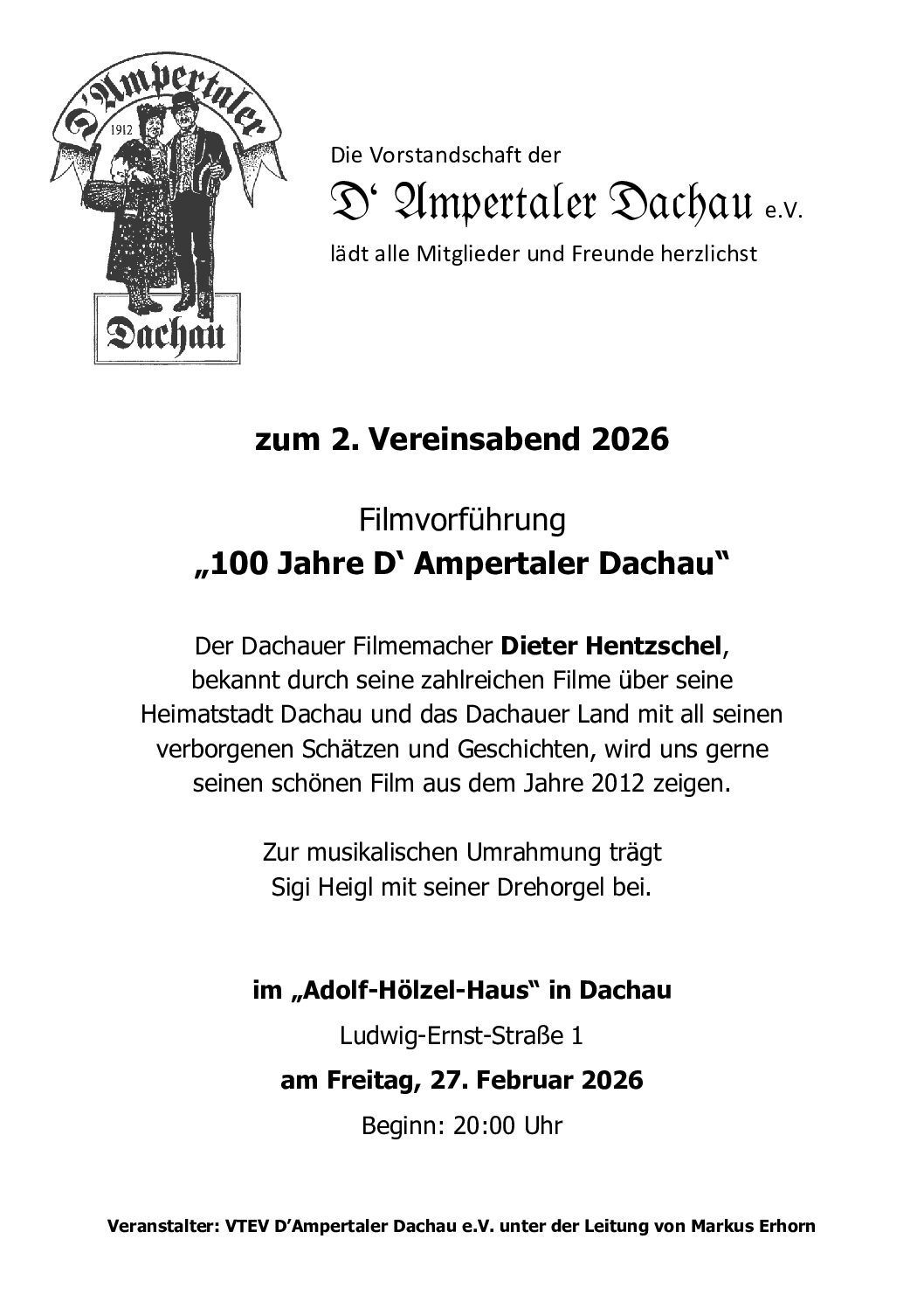 Februar 27, 2026 @ 20:00 - 23:30 Vereinsabend mit Filmvorführung (100 Jahre D’Ampertaler) Adolf-Hölzel-Saal Ludwig-Ernst-Straße 1, 85221 Dachau