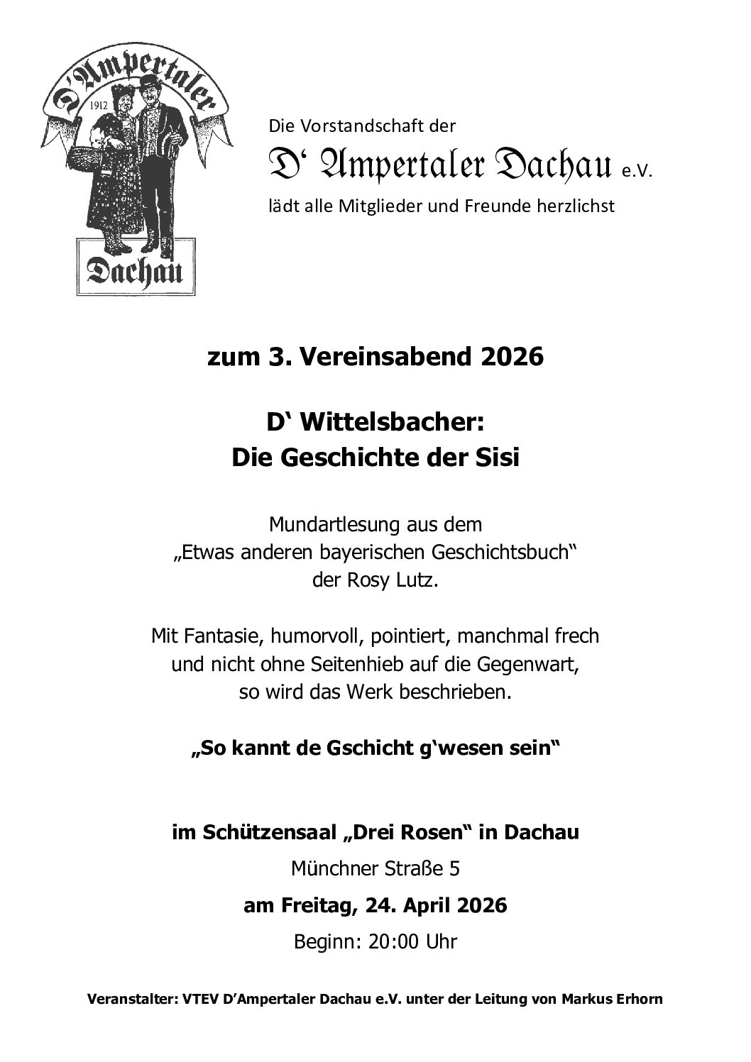 April 24, 2026 @ 20:00 - 23:30 Vereinsabend: Mundartlesung mit Rosy Lutz – D’Wittelsbacher: Die Geschichte der Sisi Drei Rosen Schützensaal