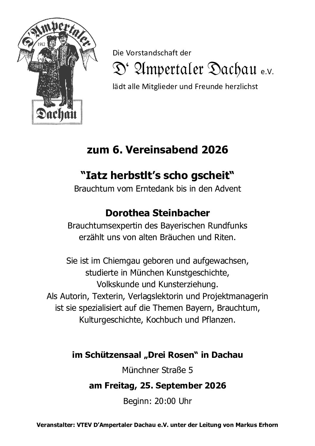 September 25, 2026 @ 20:00 - 23:30 Brauchtum vom Erntedank bis in den Advent mit Brauchtumsexpertin des bayrischen Rundfunks, Dorothea Steinbacher Drei Rosen Schützensaal
